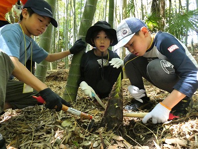 たけのこ堀りに挑戦!この時期、信太の森にはたくさんのたけのこが現れます。たけのこクッキングや竹を使ったクラフト、竹の灯りを囲んだキャンドルファイアなど森の恵みを感じるプログラムがいっぱいです!